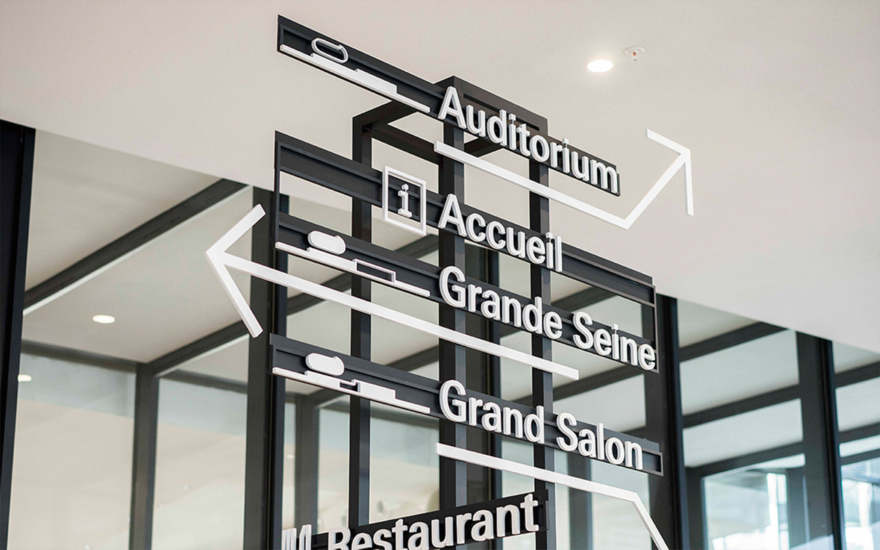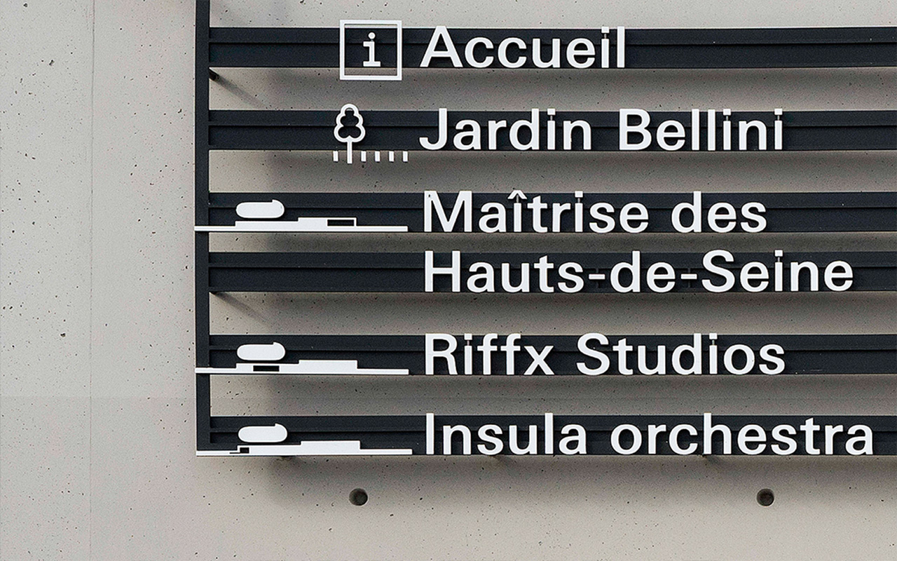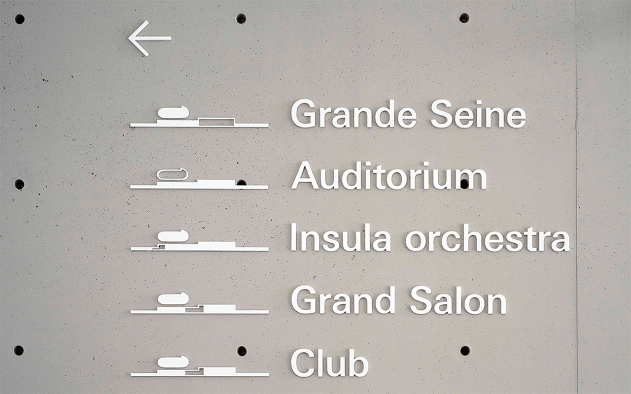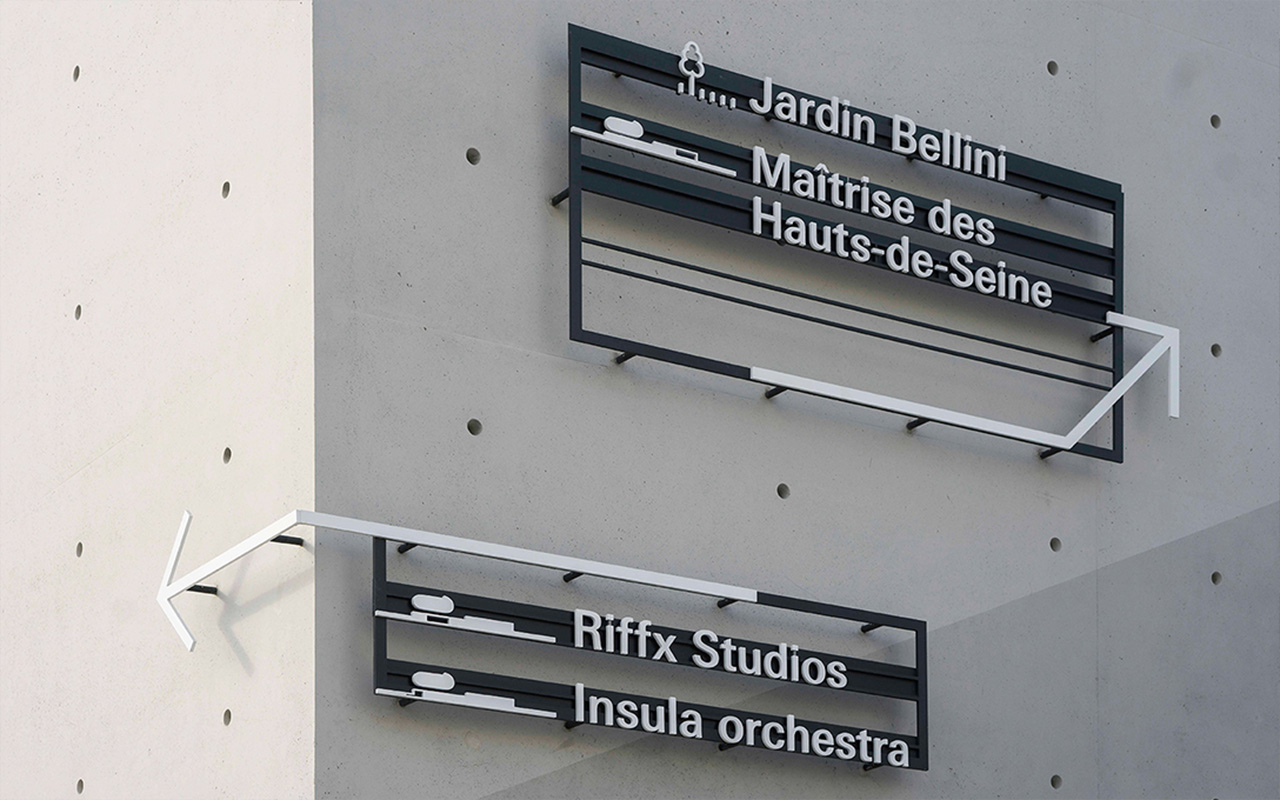 由坂茂建筑师设计,位于巴黎郊外赛甘岛上的音乐复合设施的VI与标识规划。